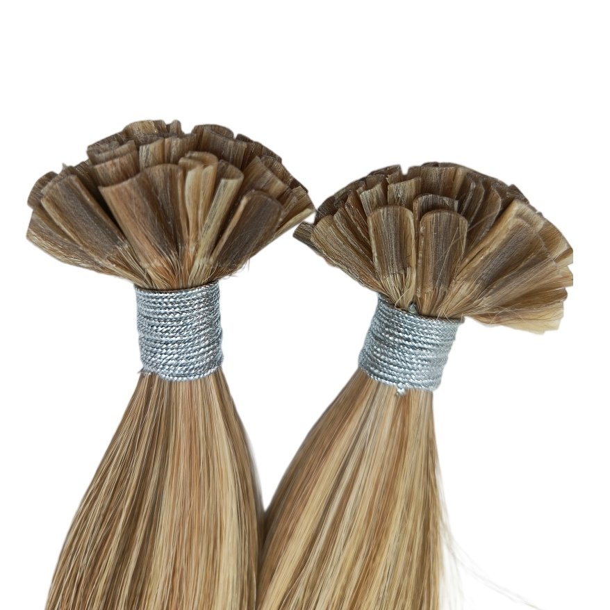 Keratin U-tip hair extensions are hair strands with a U-shaped tip made of artificial keratin (glue). They are attached to natural hair by melting the glue with a heating tool and fusing it with the original hair, providing a long-lasting hair enhancement effect.. Fusions tip hair extensions are flexible, comfortable to wear and virtually undetectable.